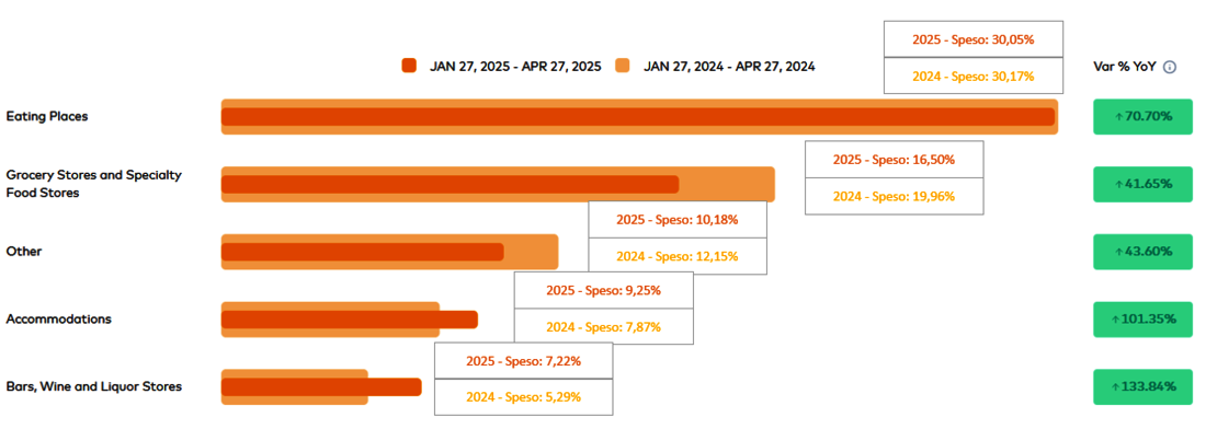 Speso percentuale dei turisti italiani sul territorio goriziano (elaborazione degli autori a partire dalla dashboard MasterCard)