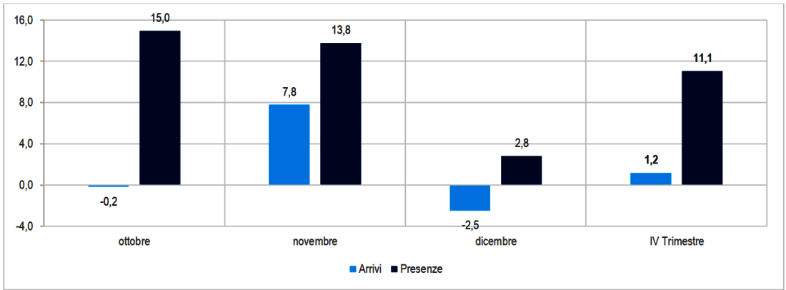 Arrivi e presenze negli esercizi ricettivi (variazioni percentuali tendenziali 2023-2024) (20250305-StatisticaToday_Turismo_IV_ trimestre_2024.pdf, s.d.).