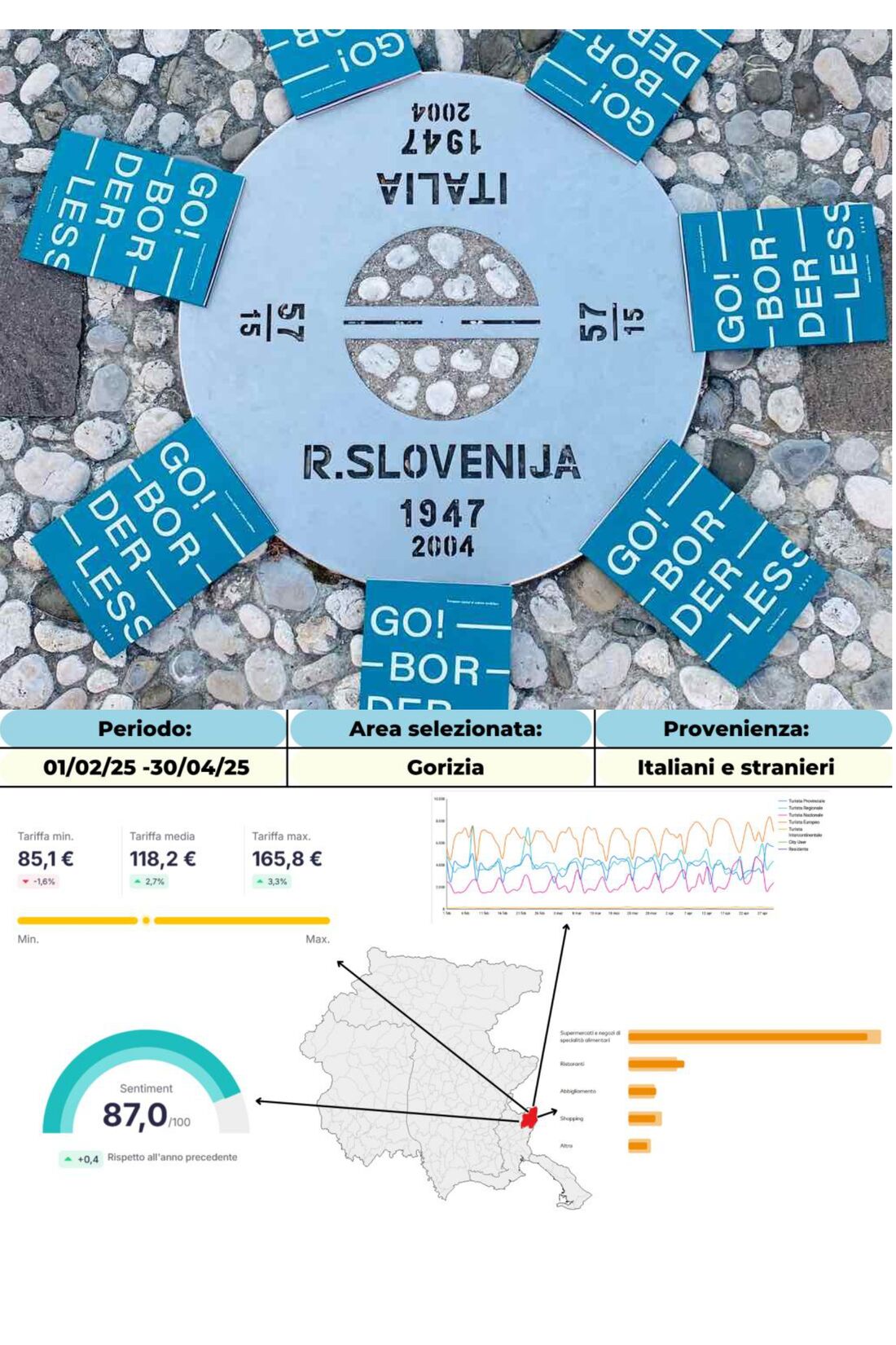 Volantini di Go!2025 sul confine tra Gorizia e Nova Gorica e un prototipo di osservatorio turistico.